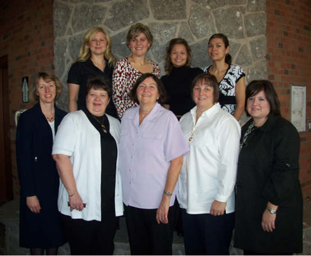 Pictured here are: 1st row left to right: Irene Koran, Director of Laurentian University School of Nursing, Pat Anglehart, Joy Savage, Rhonda Ramsey, Jennifer Clement. 2nd row left to right: Denise Lorbetski, Rosanna Furletti, Lynne Innes and Buffy Gorley-Sutherland. Missing: Helen Labine, Danae Wilson, Dana Strength . Congratulations, NP Class of 2008!